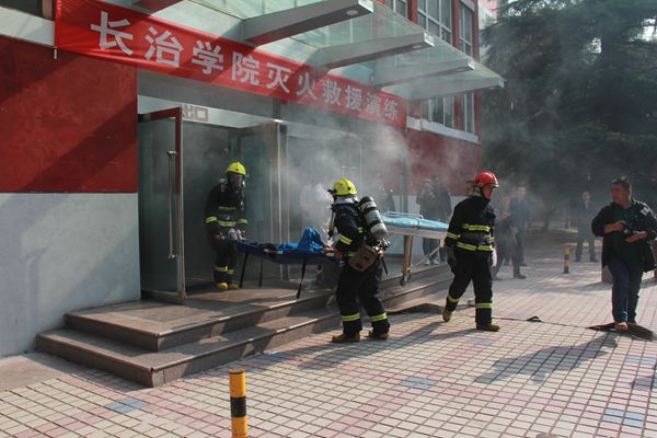 会后,长治市消防支队与我院相关部门共同组织300名新生在北校餐厅进行灭火疏散演练。在演练总指挥宣布开始后,学院立即启动应急预案,各系、处有关人员快速到达预定位置,迅速组织学生进行有序疏散。参演的学生在保卫人员的组织下,从餐厅正门有序疏散撤出,根据预先规定的路线准确、快速的到达大操场相应区域集合。医护人员到达指定位置后立即对受伤人员进行包扎处理。保卫人员在确保餐厅内无人后,随即也迅速撤离现场。师生到达操场指定位置后,由各班负责人清点人数,逃生组负责人向总指挥汇报了灭火疏散逃生演练的情况。