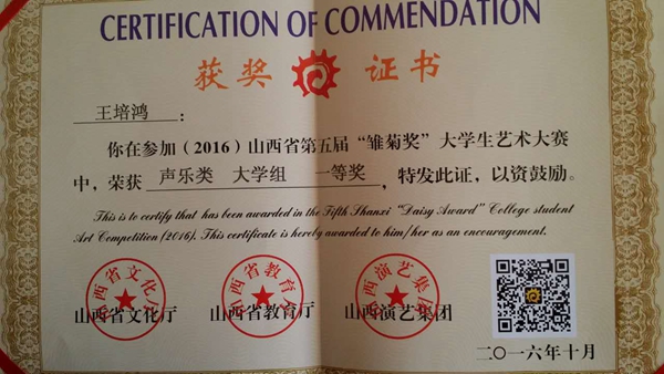 近日,我院音乐舞蹈系王培鸿同学以优异的成绩获得2016年第五届“雏菊奖”大学生艺术大赛一等奖。