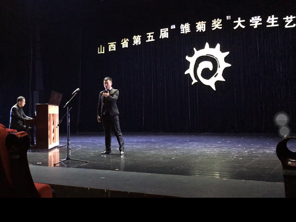 本次大赛由山西省教育厅、山西省文化厅、山西省演艺集团联合主办。共有三百多名来自山西各大高校的选手参赛,经过紧张激烈的比赛,我院音乐舞蹈系青年声乐教师王小林老师指导的2014级音乐1班王培鸿同学以优异的成绩获得一等奖,同时王小林老师被授予优秀指导教师的光荣称号。