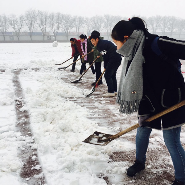12月21日从早上8点半开始,志愿者们便使用铁锹、木铲等各种工具开始清除操场跑道上的积雪,大家分工明确、秩序井然,在高效的行动之余也不失欢乐,更有同学将聚集的积雪堆成了雪人。寒冷的冬日之中,这样一些忙碌的身影似乎成了一道暖阳,温暖了整个校园。两个小时以后,本是白雪皑皑的跑道恢复了本来的模样,志愿者们顺利完成了任务。