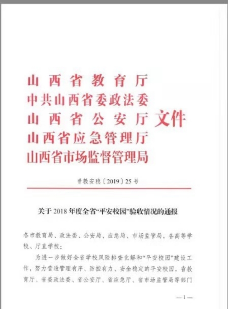 近日,省政法委、省教育厅、省公安厅、省应急管理厅、省市场监督管理局联合发文(晋教安稳〔2019〕25号)通报2018年度山西省创建“平安校园”工作先进单位,新葡的京集团8814榜上有名。