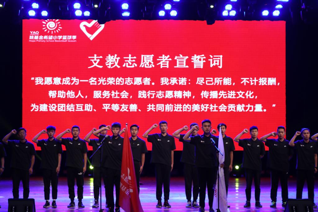 出征仪式上,北京姚基金公益基金会项目官员王丹和团中央青年志愿者行动指导中心干部刘晓宁分别为姚基金志愿者和西部计划志愿者授旗,志愿者进行了宣誓。