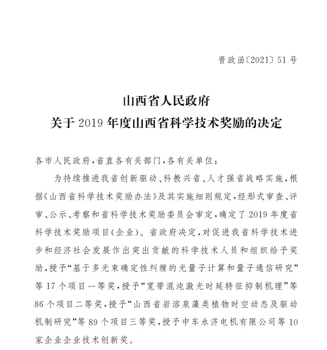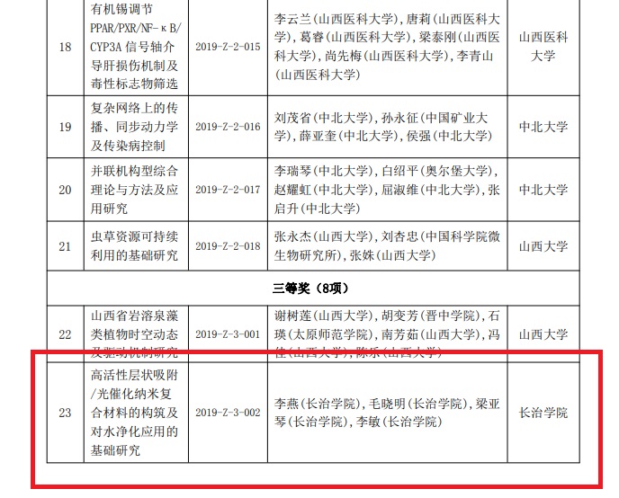 近日,山西省人民政府下发《关于2019年度山西省科学技术奖励的决定》(晋政函〔2021〕51号),根据《山西省科学技术奖励办法》及其实施细则规定,经形式审查、形式审查结果公示、学科(专业)组评审、评审委员会评审、评审委员会评审结果公示、考察和省科学技术奖励委员会审定,新葡的京集团李燕教授等人完成的《高活性层状吸附/光催化纳米复合材料的构筑及对水净化应用的基础研究》成果荣获2019年度山西省自然科学奖三等奖。