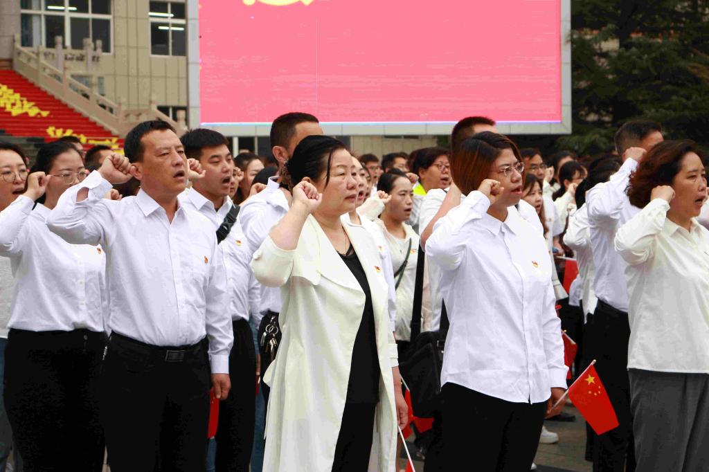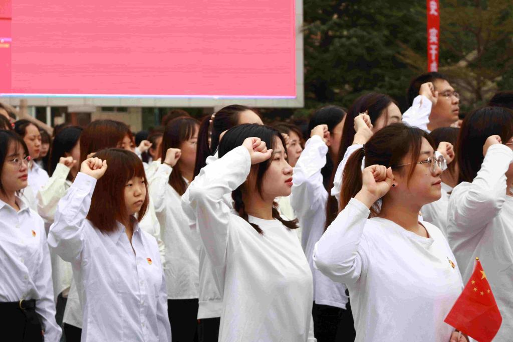 在领誓人郝勇东的带领下,大家一起面向党旗,举起右手,新党员宣誓,老党员重温入党誓词。郑重的誓言,表达了全体共产党员为共产主义奋斗终身的决心和愿望,坚定为共产主义奋斗终身的信念。随后,全体师生合唱了《没有共产党就没有新中国》,挥舞起手中的党旗,为中国共产党成立100周年感到骄傲与自豪。