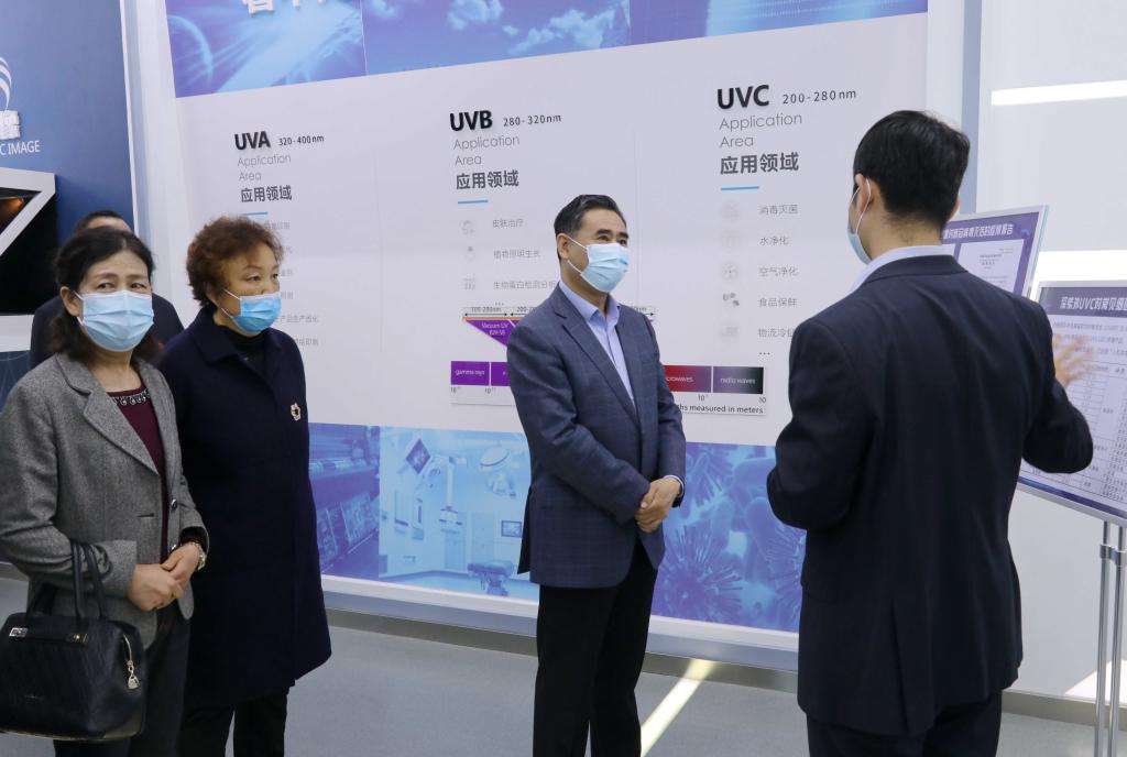 调研第一站来到山西中科潞安紫外光电科技有限公司,公司为山西省第三代半导体紫外光电工程研究中心。郝勇东一行先后参观了中科潞安一楼展厅、生产车间,听取了闫建昌总经理关于公司发展现状、生产工艺流程、产品应用、发展前景等情况的介绍。观摩了公司在深紫外产品研发、转型升级、创新发展等方面取得的成绩。参观结束后,调研团与长治市商务局、中科潞安紫外光电科技有限公司进行座谈。