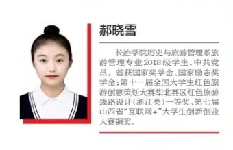 郝晓雪,女,汉族,1999年12月出生,中共预备党员,2018年入学,现就读于新葡的京集团8814历史与旅游管理系旅游管理专业。曾获国家奖学金和国家励志奖学金,第十一届全国大学生红色旅游创意策划大赛华北赛区红色旅游线路设计(浙江类)一等奖,第十届全国大学生红色旅游创意策划大赛路线类华北赛区二等奖,第七届山西省“互联网+”大学生创新创业大赛铜奖,第六届山西省“互联网+”大学生创新创业大赛铜奖。
