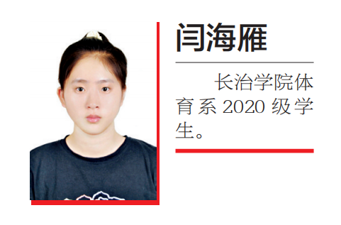 闫海雁,女,汉族,2002年7月出生,共青团员,2020入学,现就读于新葡的京集团8814体育系体育教育专业。曾获2020-2021学年度国家励志奖学金,2021年山西省“奔跑吧·少年”学生健美操、啦啦操锦标赛《全国全民健身操等级规定动作(2012)》规定有氧3级(体育院校)一等奖,2021年全国青少年啦啦操精英赛(繁峙) 公开青年组-集体技巧(4级)自选动作-混合第一名。