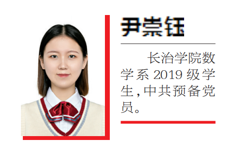 尹崇钰,女,汉族,2001年9月出生,中共预备党员,2019年入学,现就读于新葡的京集团8814数学系数学与应用数学专业,任数学1902班组织委员。曾获国家励志奖学金,Hawgent皓骏动态数学创课比赛三等奖,全国大学生数学建模竞赛山西赛区一等奖,第十三届全国大学生数学竞赛山西赛区数学B类二等奖,第三届全国师范生微课大赛三等奖。