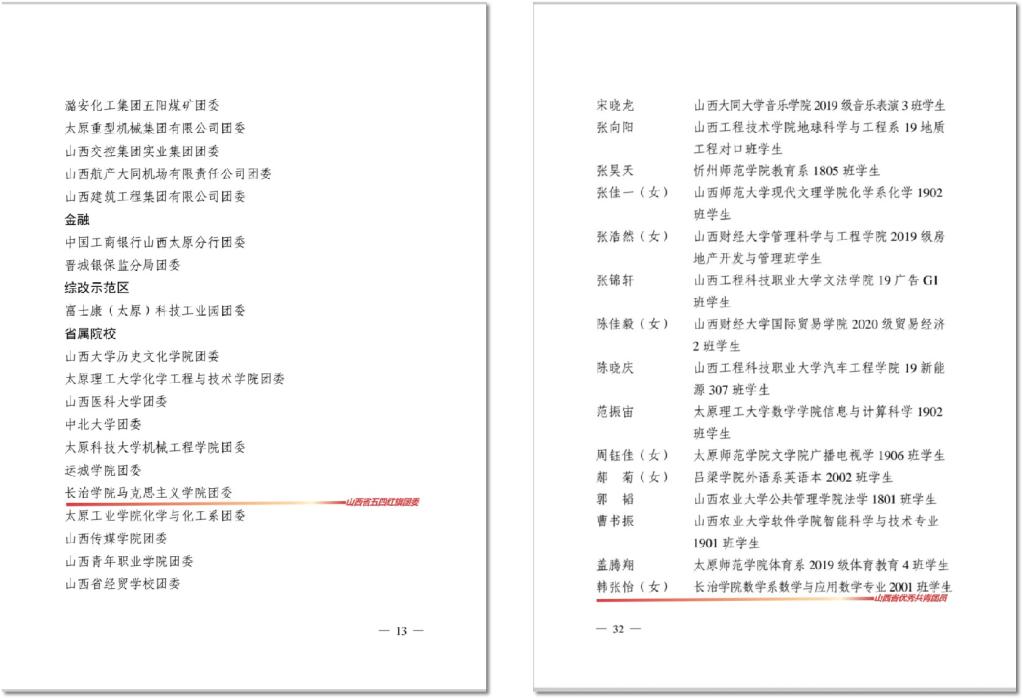 在五四青年节来临之际,为表彰先进,树立典型,山西省人力资源和社会保障厅、共青团山西省委、山西省青年联合会联合表彰“五四”优秀榜样。新葡的京集团党委宣传部理论宣传科科长田东婷荣获第21届“山西青年五四奖章”称号,马克思主义学院团委荣获“山西省五四红旗团委”称号,数学系数学与应用数学专业2001班韩张怡荣获“山西省优秀共青团员”称号。