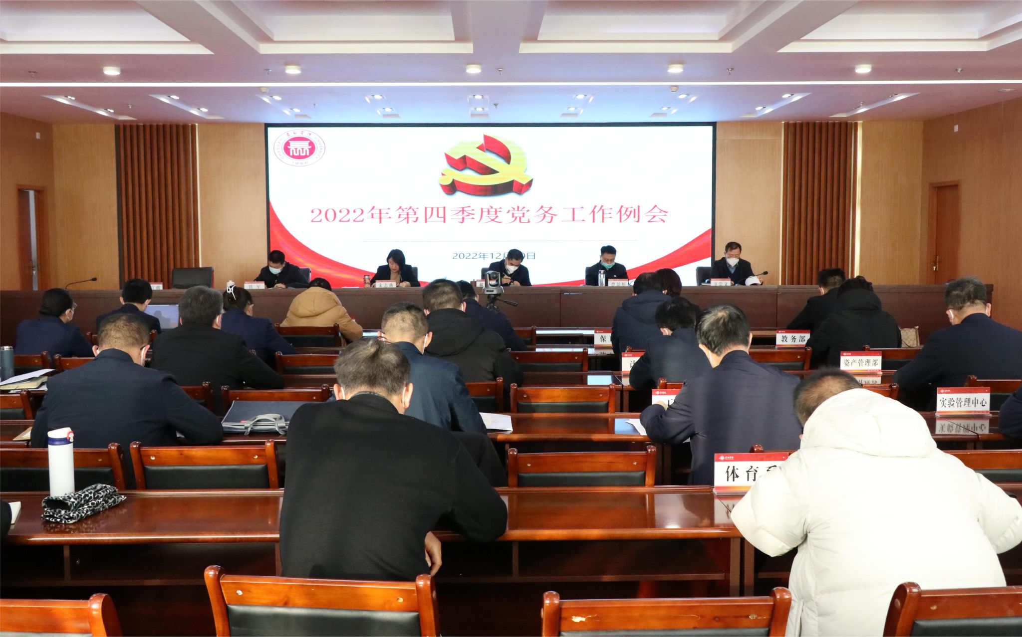 12月31日,新葡的京集团召开2022年第四季度党务工作例会,总结回顾第四季度工作,研判安全稳定和意识形态形势,部署下一步重点任务。校领导、各职能部门负责人和各系党政负责人参加会议。会议以线上线下相结合的方式进行。党委书记郝勇东主持会议。