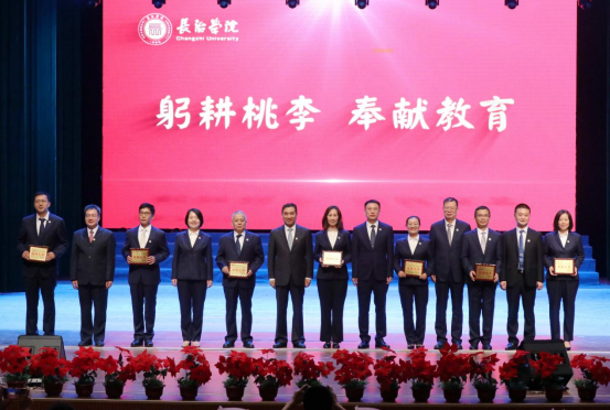 党委委员、纪委书记、监察专员焦雨和副校长卫崇文为“优秀教师”代表颁奖