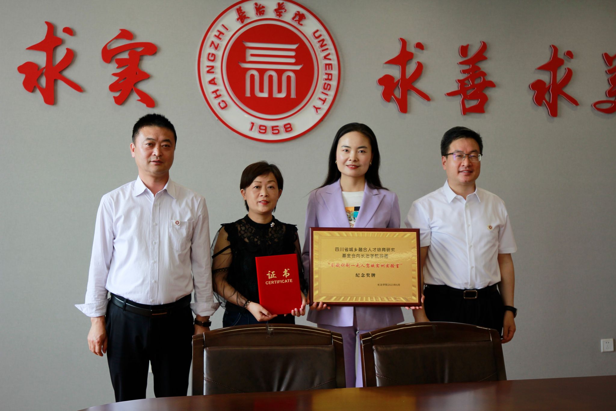 铁军和王志军为基金会颁发捐赠奖牌和捐赠证书