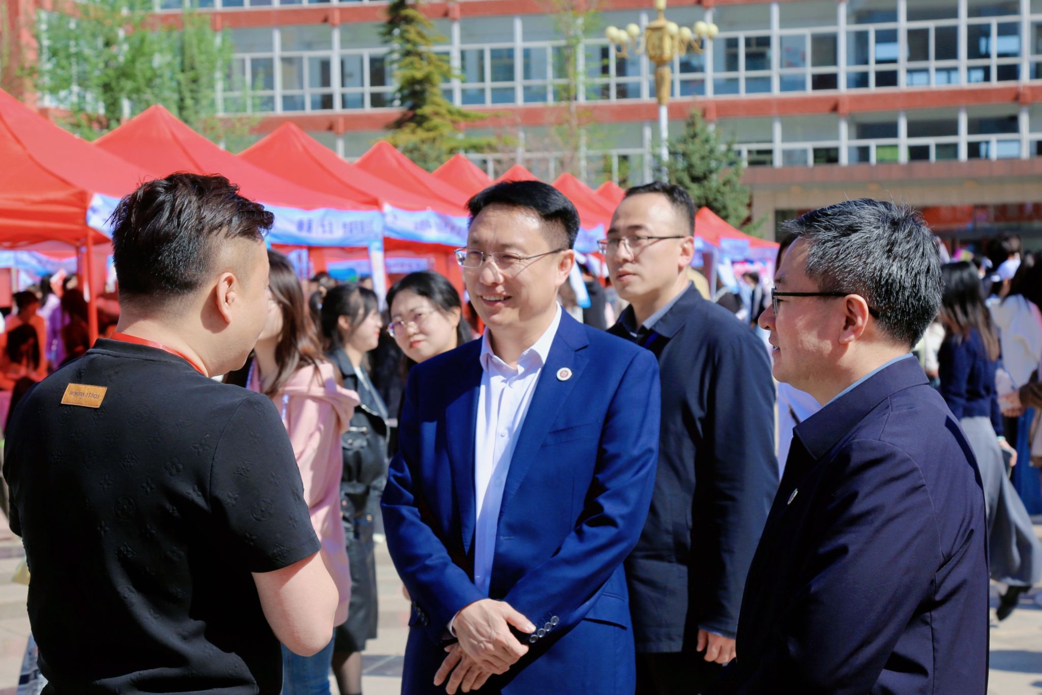 校党委书记曹景川,党委委员、副校长王志军及相关部门负责人,现场走访用人单位,仔细察看招聘单位需求信息,与用人单位代表深入交流,感谢各单位长期以来对学校就业工作的支持,并与参会毕业生亲切交流,询问同学们的求职情况及求职意愿,鼓励和引导毕业生树立科学的成才观和就业观。