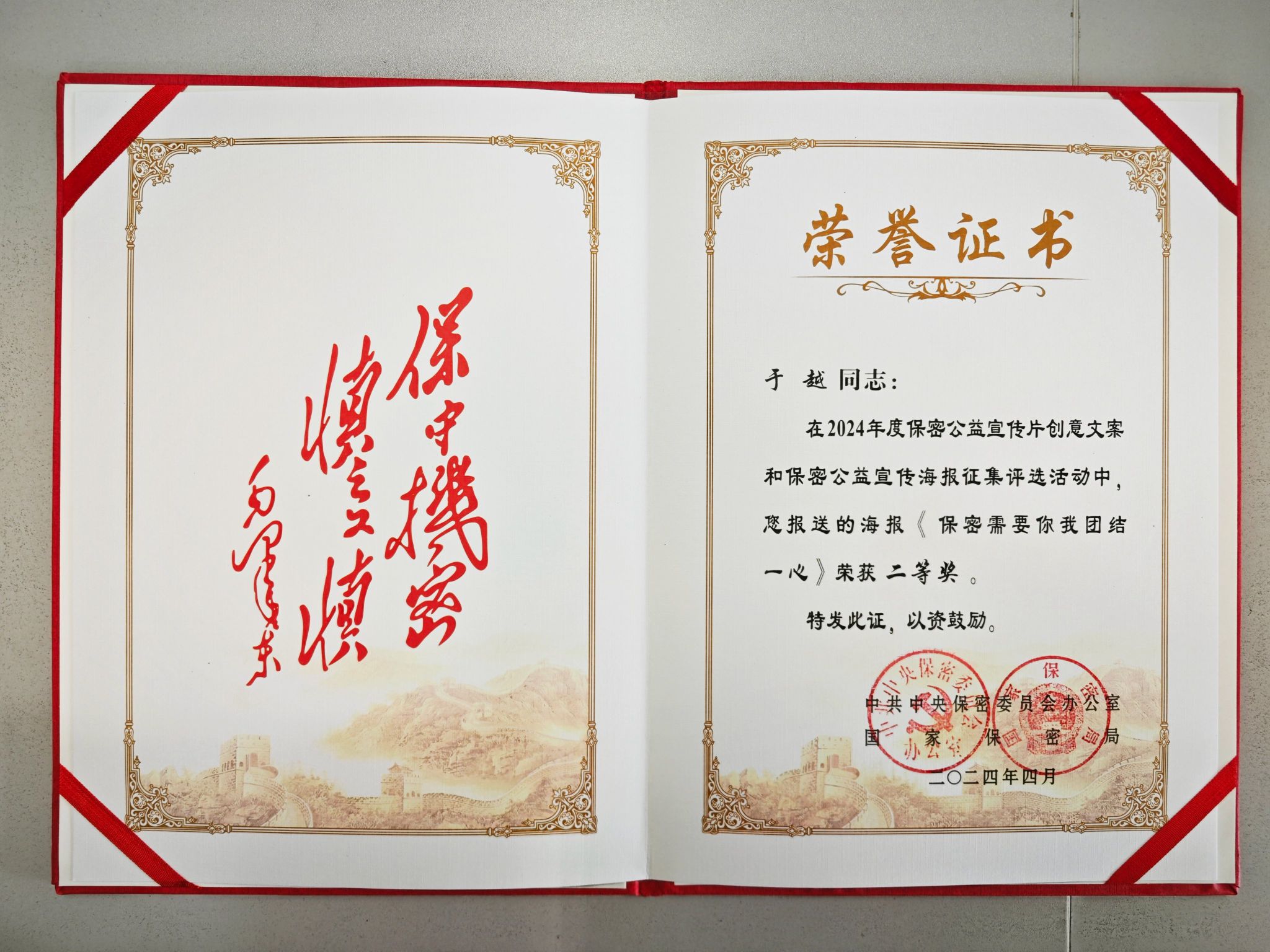 近日,中央保密办、国家保密局公布2024年度保密公益宣传片创意文案和保密公益宣传海报征集评选活动结果,新葡的京集团美术系教师于越报送的海报《保密需要你我团结一心》荣获二等奖。
