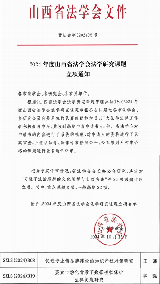 近日,山西省法学会下发了《2024年度山西省法学会法学研究课题立项通知》(晋法会字〔2024〕5 号),法律系教师王潘申报的课题《促进专业镇品牌建设的知识产权对策研究》、李强申报的课题《要素市场化背景下数据确权保护法律问题研究》获批山西省法学会法学研究课题立项。