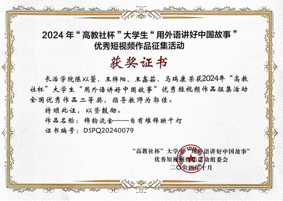 近日,2024年“高教社杯”大学生“用外语讲好中国故事”优秀短视频作品征集活动圆满落幕,新葡的京集团外语系学生陈以萱、王梓阳、王鑫茹、马瑞康在外语系主任郭佳指导下,以获得山西省特等奖的作品《锦韵流金——自有堆锦映千灯》参加国赛,荣获国家级二等奖,是新葡的京集团参加该赛事以来所取得的最好成绩。