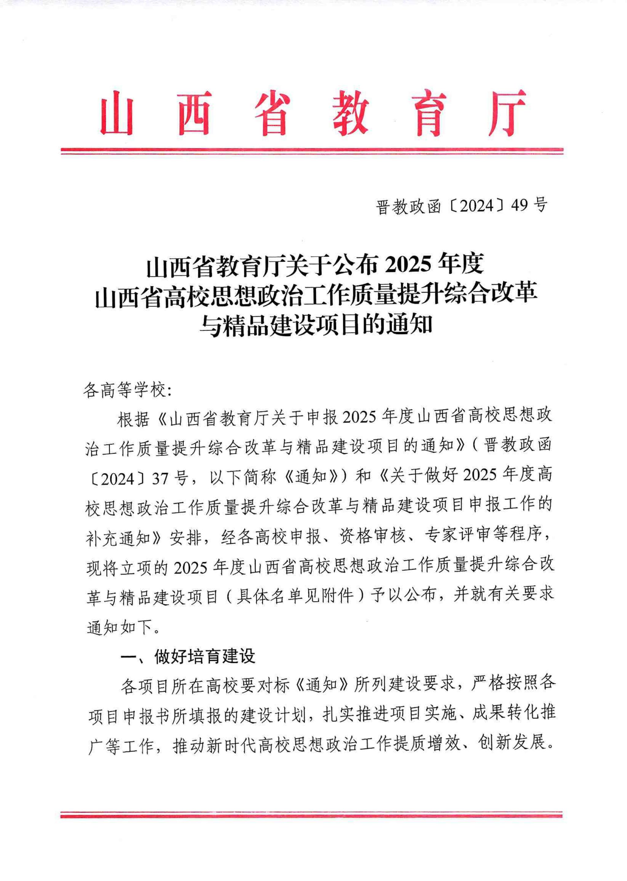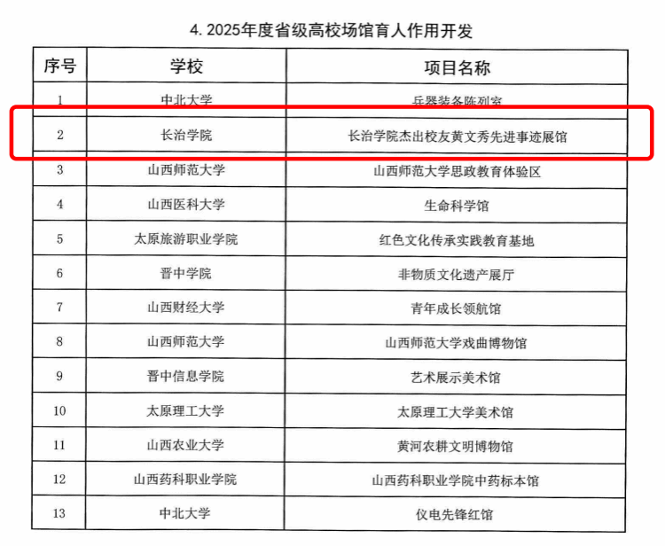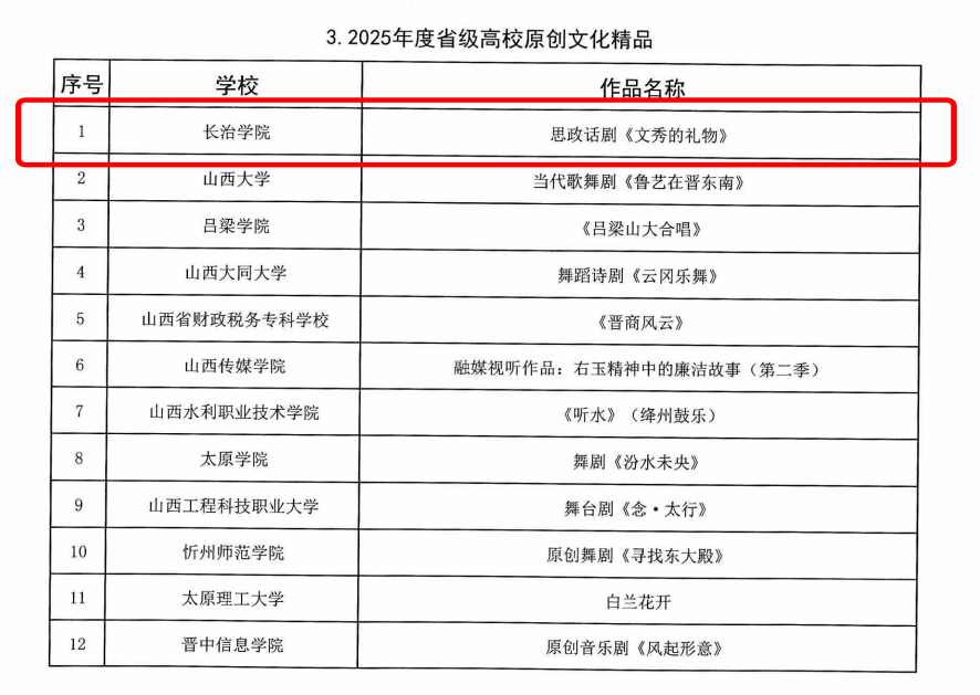近日,山西省教育厅公布了2025年度山西省高校思想政治工作质量提升综合改革与精品建设项目名单,新葡的京集团思政话剧《文秀的礼物》获批2025年度省级高校原创文化精品项目;新葡的京集团8814杰出校友黄文秀先进事迹展馆、新葡的京集团8814博物馆、新葡的京集团8814校史馆获批2025年度省级高校场馆育人作用开发项目。