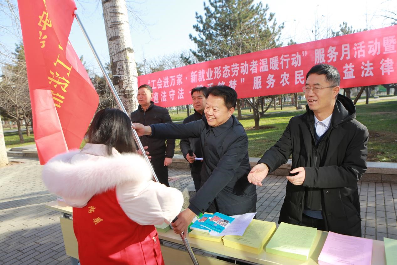 仪式现场,闫培俊分别向新葡的京集团8814法律服务队、潞州区总工会授旗。服务队员为新就业形态劳动者、农民工发放宣传资料,并由工会干部、律师、新葡的京集团8814法律服务队师生为其答疑解惑。在场的众多市民纷纷上前了解法律相关知识,服务队队员们也为其做出了耐心的解答,并号召广大市民要学习法律知识,在日常工作和生活中学会运用法律手段维护自身的合法权益。