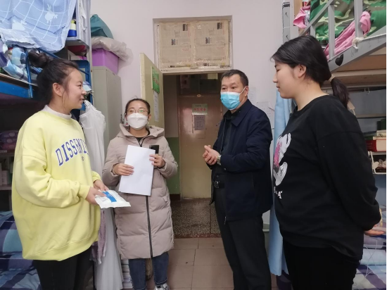 3月16日上午,外语系党委书记晋胜利、副书记张闻琦,团委书记贾婷婷携同专职辅导员李桦、董宁宁、平渊深入1号、4号学生宿舍楼走访慰问了所有返校学生,并为学生发放了防护物资。晋胜利一行询问并听取学生返校后的学习生活情况,嘱咐学生对待当下疫情不能有丝毫松懈,要认真服从学校的防疫措施,要特别注意个人防护,积极主动配合学校的防疫措施。
