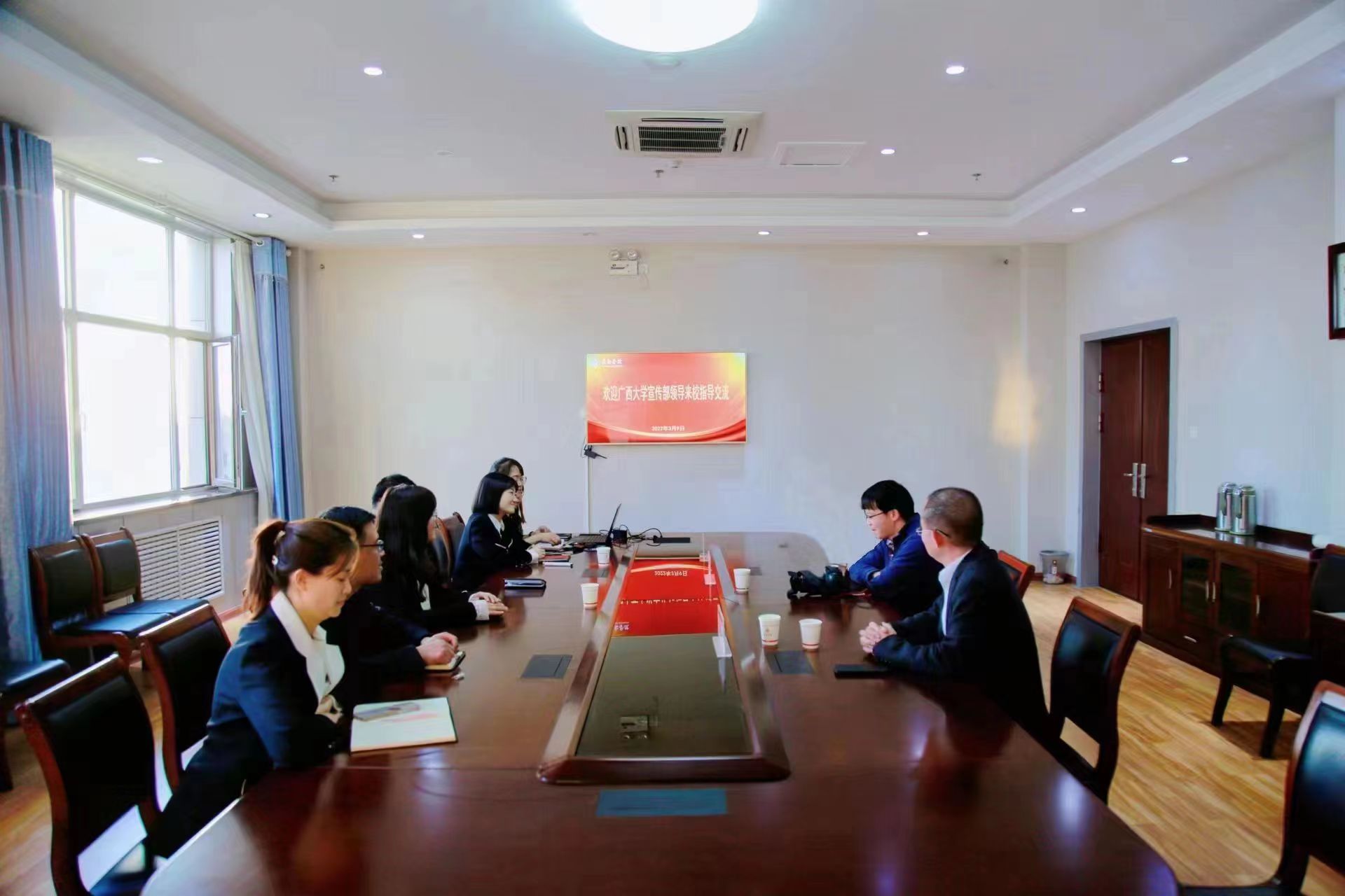 3月9日,广西大学党委宣传部副部长覃安基、文明办副主任陈德文一行来新葡的京集团进行考察交流。党委委员、宣传部部长蔡璐等陪同。