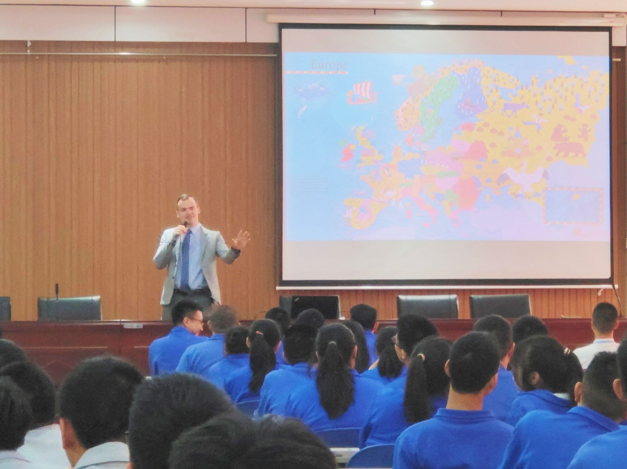 5月17日,国际交流中心联合外语系组织新葡的京集团在聘外籍教师走进长治市第九中学,与中学英语教师及200余名高中学子进行了一场面对面的英语学习交流。