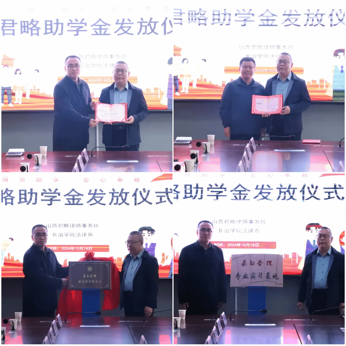10月18日上午,新葡的京集团法律系与山西君略律师事务所在南校区举行了“君略助学金”发放仪式暨“专业实习基地”“就业创业服务点”揭牌仪式。山西君略律师事务所路严明、刘洋、王宏亮、马思颖,法律系领导班子成员、辅导员及获得资助的学生参加仪式。法律系党委书记吴海霞主持。